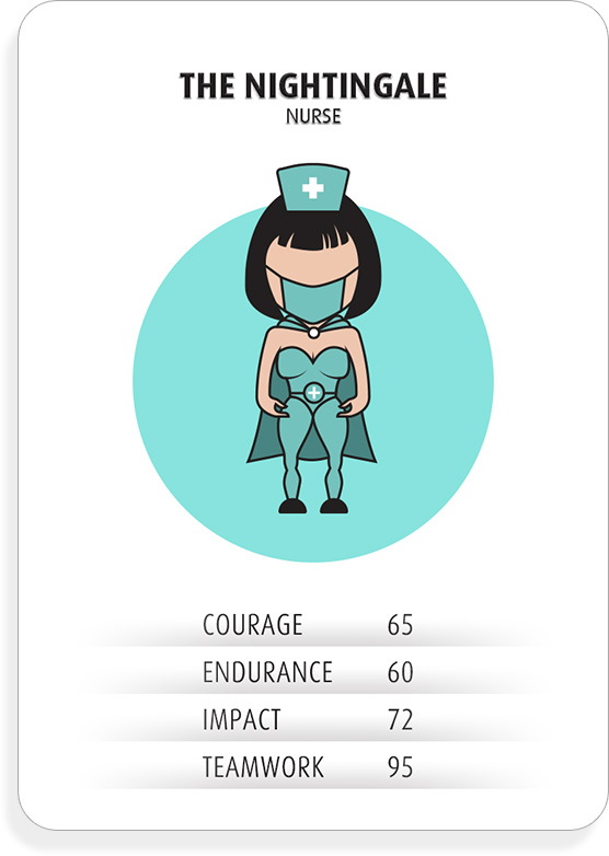 My solution was to create a vibrant and inclusive visual identity that captured the spirit of everyday heroism. The logo featured bold, playful typography with a shield motif to suggest protection and strength. Each of the 60 character cards were illustrated with unique, stylized artwork highlighting essential workers such as nurses, teachers, and delivery drivers. The card templates used bright colours and clear stat sections for easy gameplay. The rulebook was designed with simple icons and step-by-step visuals to aid comprehension. Packaging combined collectible appeal with a cheerful tone, reflecting the game’s core values of empathy, resilience, and strategic fun.