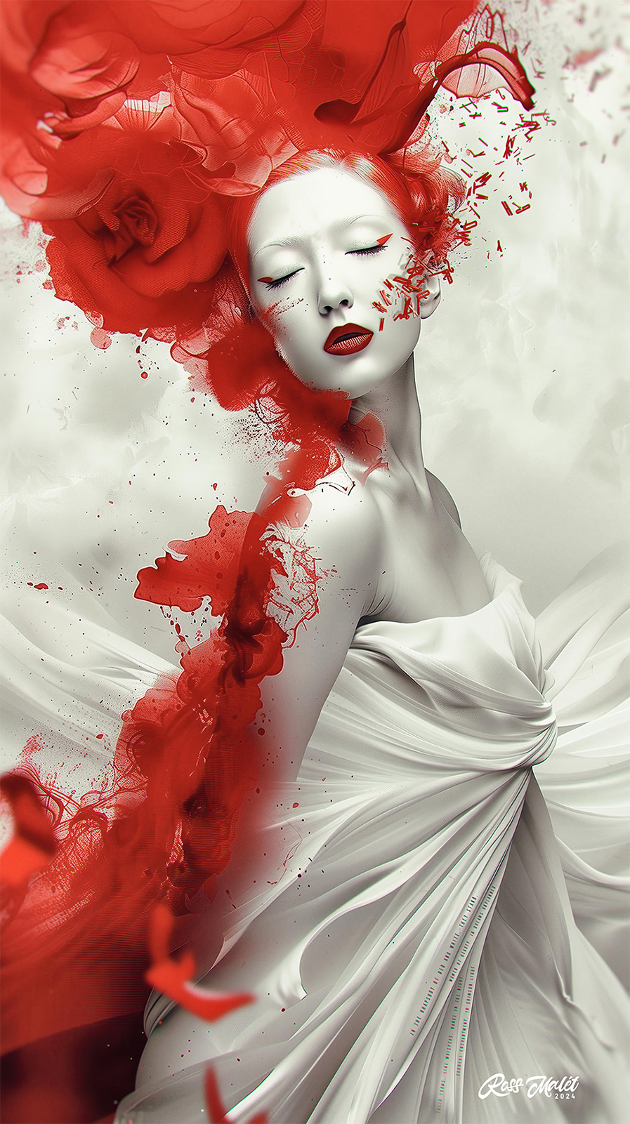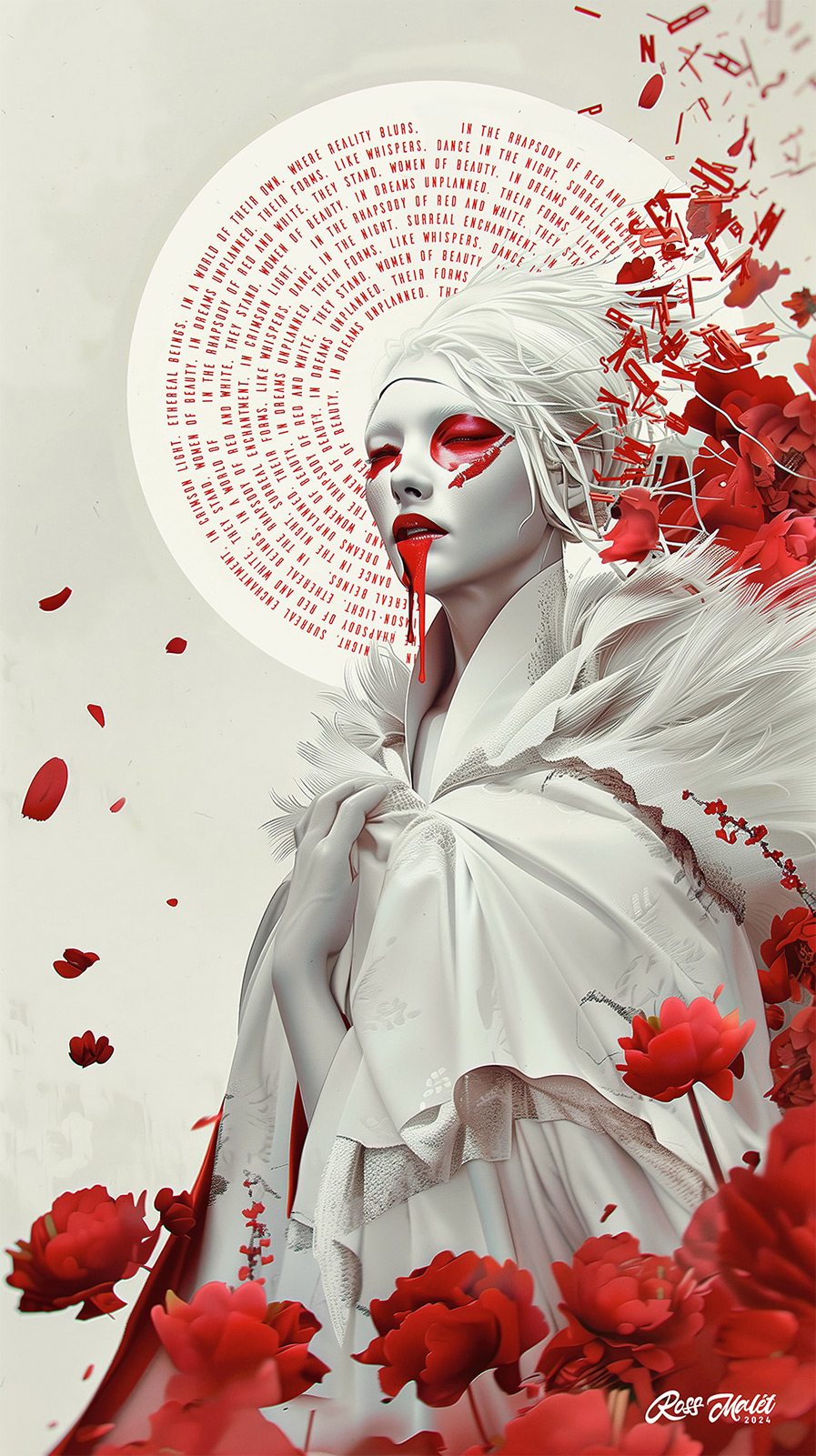 In the rhapsody of red and white, they stand, Women of beauty, in dreams unplanned. Their forms, like whispers, dance in the night, Surreal enchantment, in crimson light. Ethereal beings, in a world of their own, Where reality blurs, and dreams are sown. Each brushstroke a melody, a crimson trance, Capturing essence, in a surreal dance. Scarlet shadows play upon their skin, Mystical allure, drawing us in. In the canvas realm, they silently call, Beckoning us closer, to delve in their thrall. A symphony of crimson, a tapestry of white, In this surreal rhapsody, they reign in the night. Each stroke, each line, a whispered tale, Of beauty surreal, in a crimson veil. So let us wander in this red-hued domain, Where rhapsodic beauty transcends mundane. For in this surreal collection, we find, A red rhapsody eternal, forever entwined.