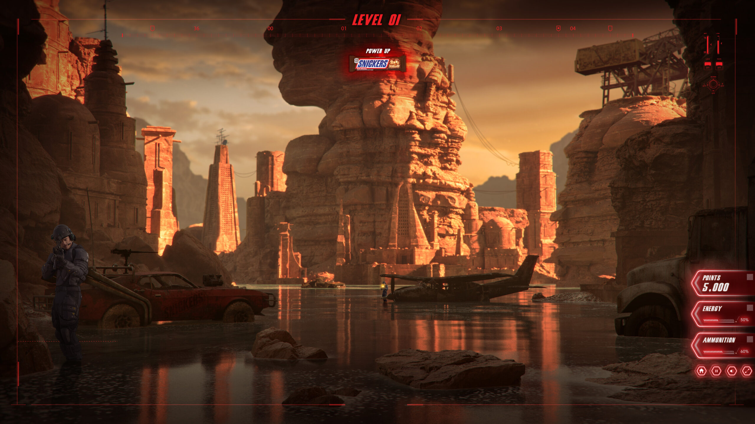 The final key visual for the game is a dramatic desert scene bathed in warm sunset light, featuring ancient temple ruins, sculpted rock formations, and post-apocalyptic vehicles. A massive carved stone head dominates the landscape, creating an epic, cinematic mood. This visual sets the tone for the Snickers gaming experience—bold and unforgettable.
