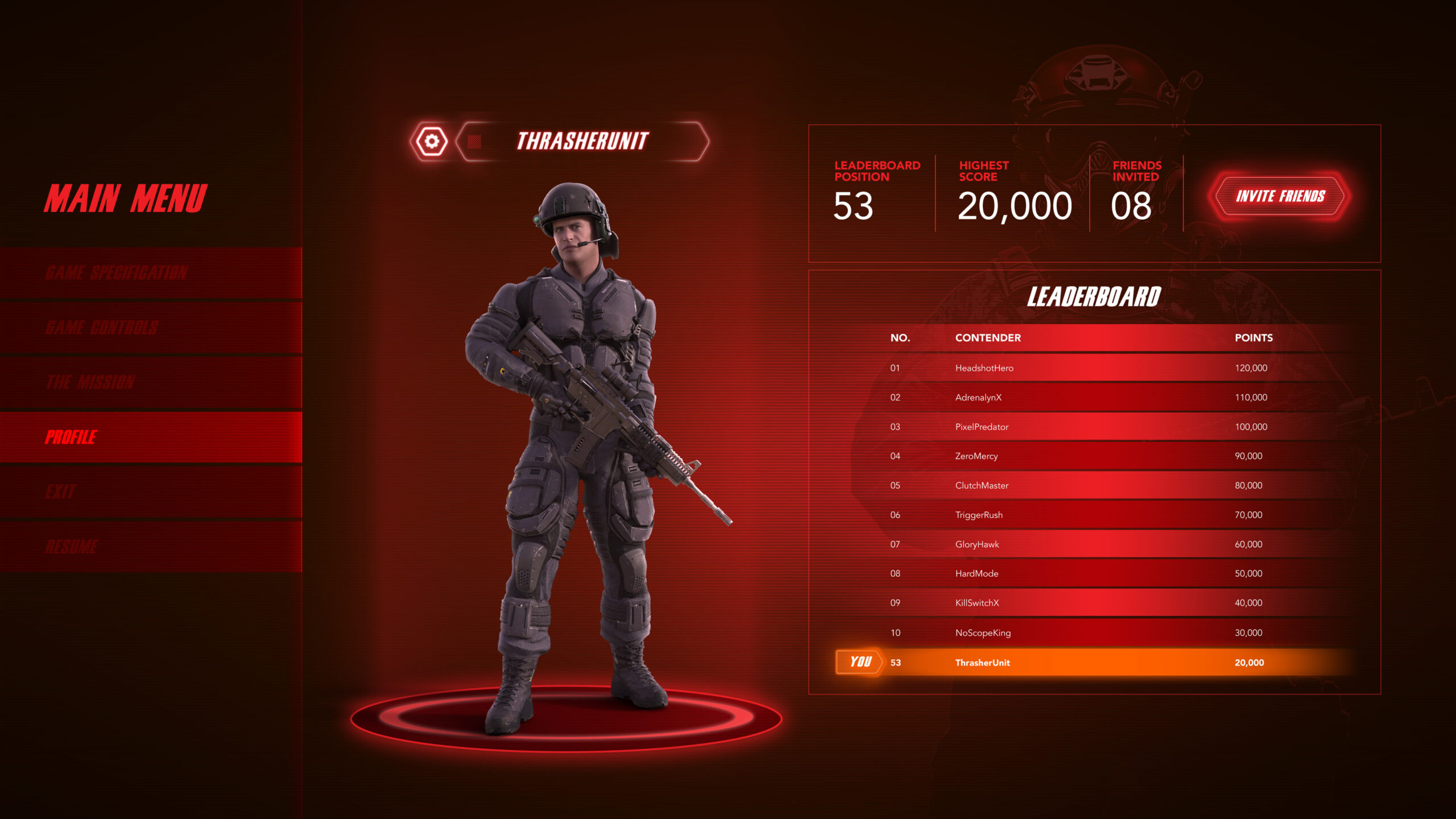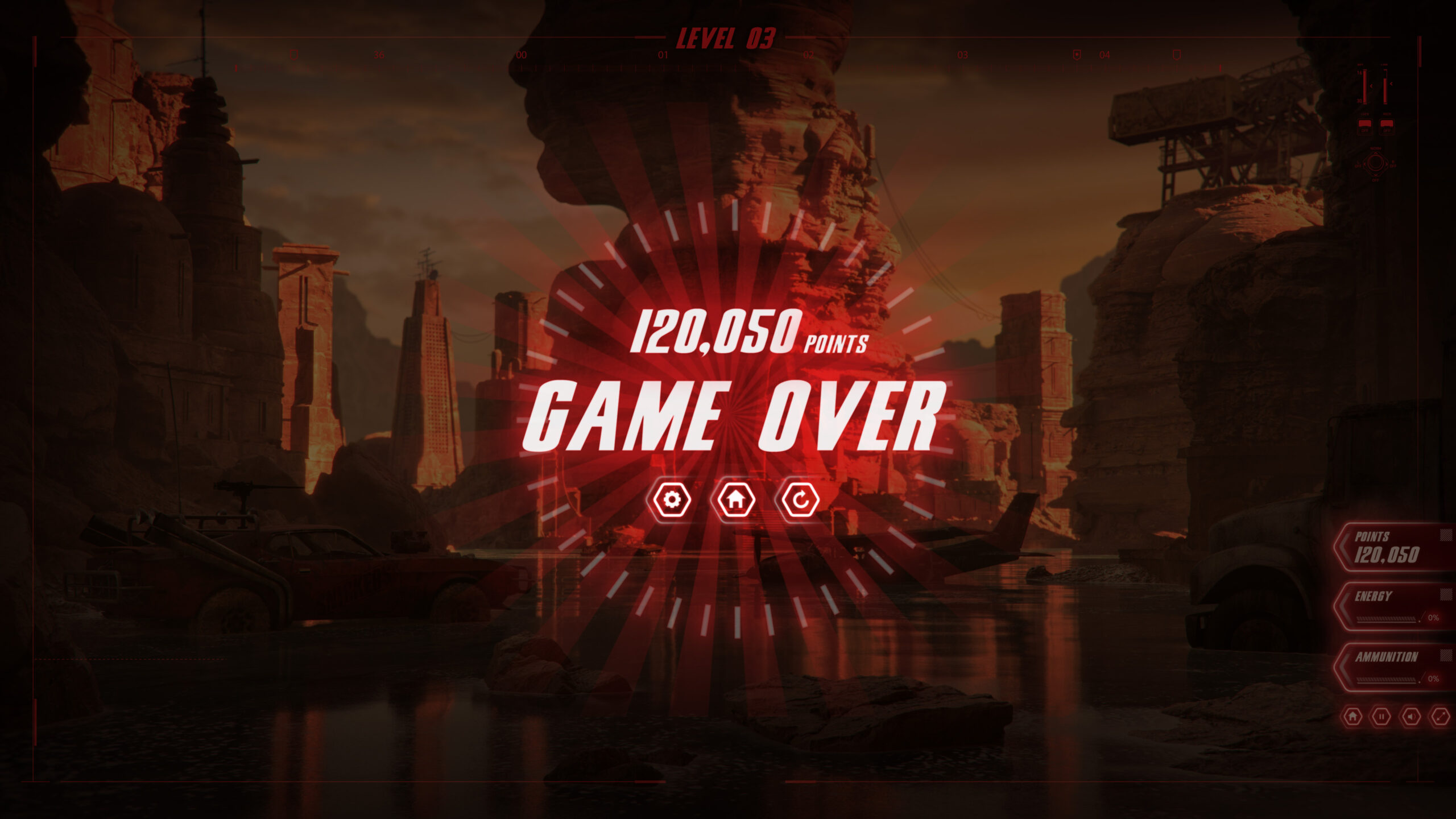 The game’s UI was designed to be clean, bold, and intuitive—prioritising fast gameplay and minimal distractions. Visual cues, targeting reticles, and point counters were styled with a military-sci-fi aesthetic to match the overall tone. Interface elements were optimized for quick recognition and responsiveness across both desktop and console formats.