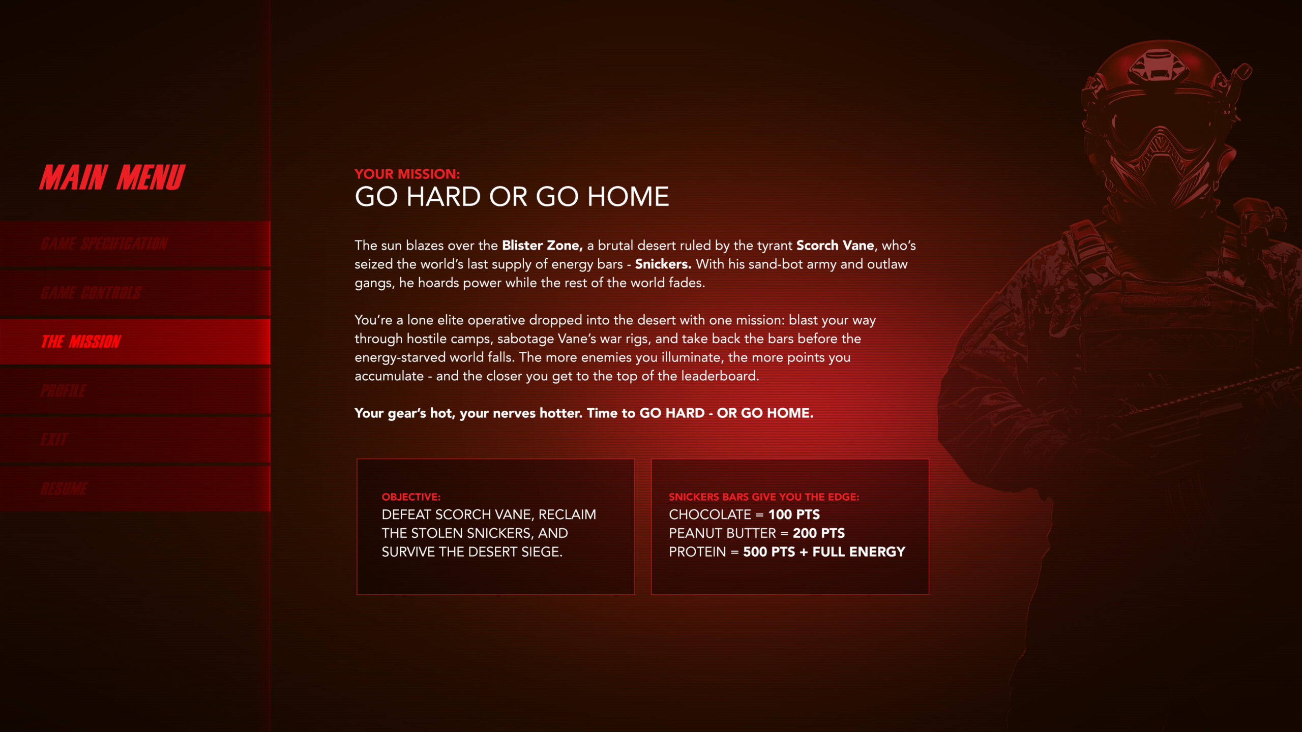 The microsite was designed to reflect the high-energy, combat-driven theme of the game while delivering a seamless user experience. Visually bold and immersive, it featured strong typographic hierarchy, cinematic imagery, and interactive elements that echoed the game's military-sci-fi aesthetic. The layout guided users intuitively from registration to gameplay, while backend integration captured valuable user data. Optimised for performance across devices, the site functioned as both a marketing hub and a portal into the Snickers "Go Hard or Go Home" experience.